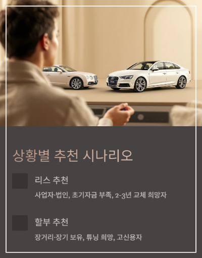 ① 개인사업자‧법인은 세금 절감과 자산 부채 비노출을 위해 리스가 유리합니다. ② 초기 자금이 부족하고 2~3년마다 새 차를 타고 싶은 개인도 리스를 고려하세요. ③ 장거리·장기 보유 예정이거나 튜닝·중고 매각 수익을 노리는 소비자는 할부가 적합합니다. ④ 고신용자·저금리 시대엔 할부 금리 혜택이 클 수 있으니 딜러 견적을 꼭 비교해 보세요.