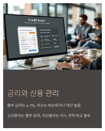 2025년 기준 시중은행 자동차 할부 금리는 4%대 후반이며, 카드사·캐피털은 5~7% 수준입니다. 리스사는 통상 조달금리에 마진을 얹어 비슷하거나 약간 높은 수준으로 책정합니다. 다만 리스는 ‘금리 고정’이 많아, 인상기에는 이점이 있고, 인하기에는 손해일 수 있습니다. 고신용자는 할부로 낮은 금리를 받기 쉬우며, 신용점수가 낮다면 VAT 포함 리스료가 더 싸게 나올 때도 있어 견적 비교가 필수입니다.